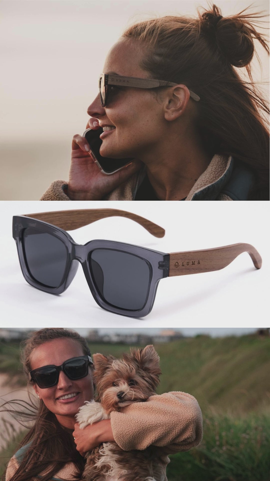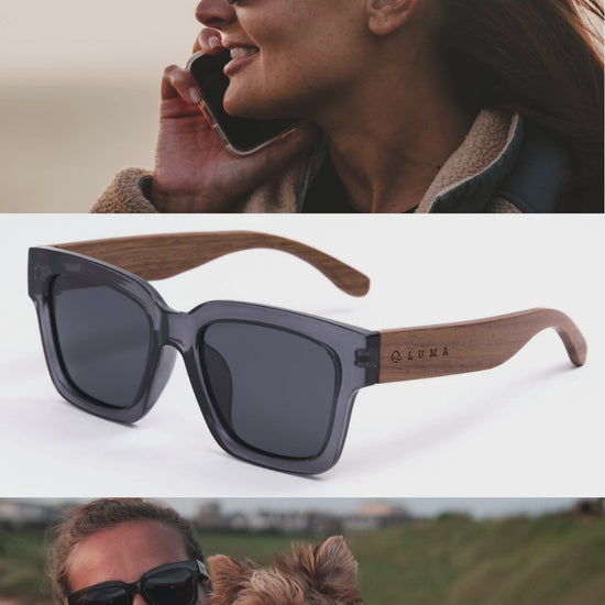 Luma Sunglasses - Polzeath - Smoke. Inspired by the rugged beauty and vibrant surf culture of Polzeath Beach, the Polzeath Wooden Sunglasses are designed for adventurers who live for the sea. Featuring bold yet lightweight frames and sustainably sourced wooden arms, they reflect the natural charm of this Cornish surfing hotspot.