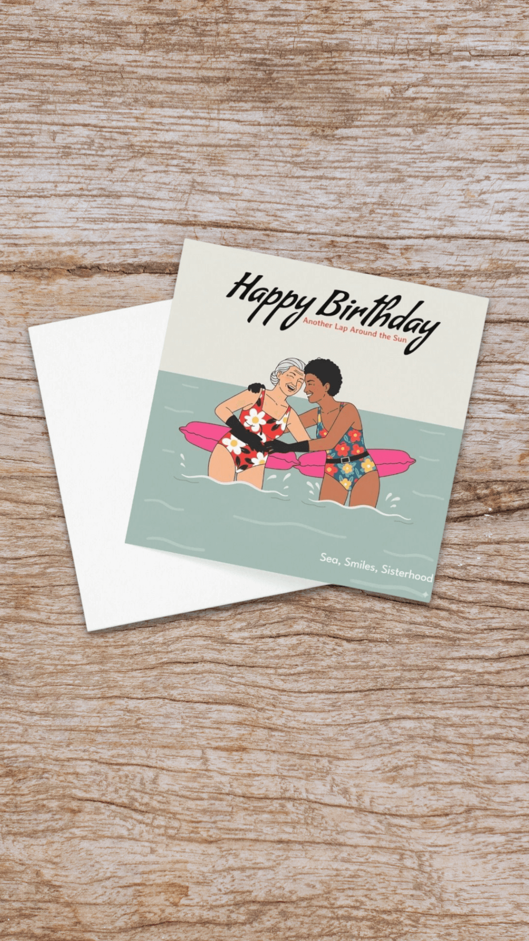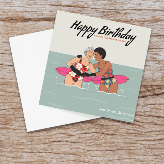 Celebrate the beauty of friendship and the joy of shared memories with this heartwarming birthday card. Featuring two women in bright, floral swimsuits laughing together in the sea, this design captures the essence of sisterhood, sunshine, and another lap around the sun.