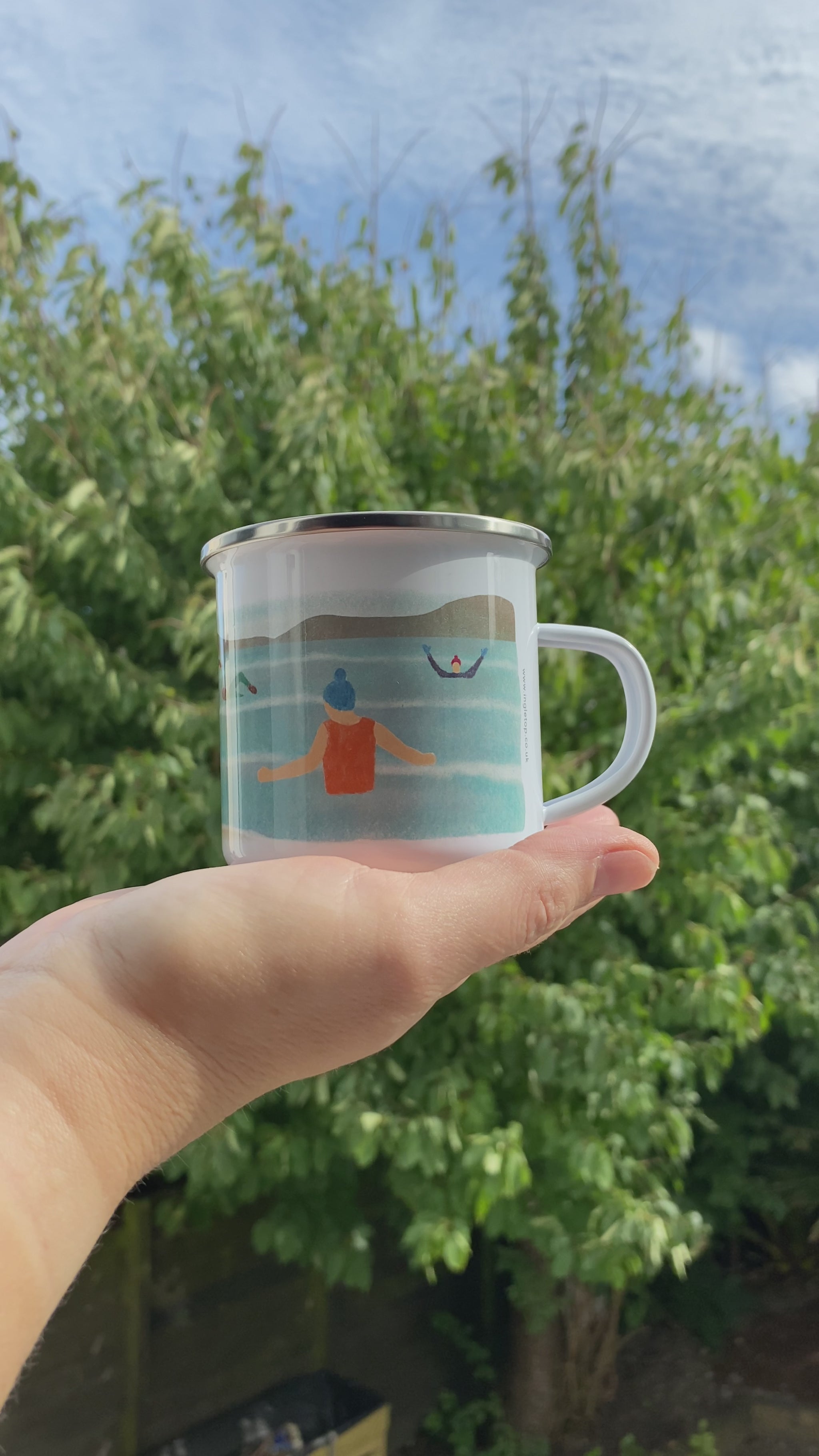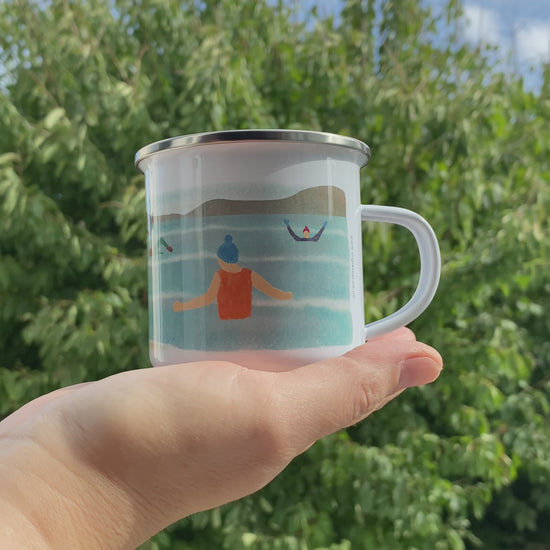 Wild Swimming Enamel Mug. Celebrate the invigorating joy of open water with our Wild Swimming Enamel Mug, featuring a playful illustration of swimmers taking a refreshing dip. Designed for nature lovers and wild swimming enthusiasts, this mug brings outdoor energy into your everyday routine.